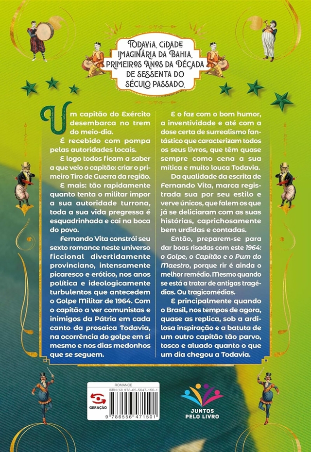 Neste divertidíssimo quinto volume de sua saga na imaginária cidade baiana de Todavia, Fernando Vita nos vem com a história de um capitão do Exército que ali desembarca no trem do meio-dia e é recebido com pompa pelas autoridades locais. A situação política do País do país é instável. Logo ficam sabendo a que veio o capitão: criar o primeiro Tiro de Guerra da região. E mais: tão rapidamente quanto tenta o militar impor a sua autoridade turrona, toda a sua vida pregressa é esquadrinhada e cai na boca do povo. Fernando Vita constrói seu sexto romance neste universo ficcional divertidamente provinciano, intensamente picaresco e erótico, nos anos política e ideologicamente turbulentos que antecedem o Golpe Militar de 1964. O capitão vê comunistas e inimigos da Pátria em cada canto da prosaica Todavia e a situação piora quando vem o golpe militar e os dias medonhos que se seguem. Tudo isso escrito com bom humor, inventidade e o surrealismo fantástico que caracterizam todos os seus livros. Então, preparem-se para dar boas risadas com este 1964: o golpe, o capitão e o pum do maestro, porque rir é ainda o melhor remédio. Mesmo quando se está a tratar de antigas tragédias. Ou tragicomédias. E principalmente quando o Brasil, nos tempos de agora, quase as replica, sob a ardilosa inspiração de um outro capitão tão parvo, tosco e aluado quanto o que um dia chegou a Todavia. Os outros livros da série – que podem ser lidos separadamente – são: "Cartas anônimas" (2011), "O avião de Noé" (2014) e "República dos mentecaptos" (2019). É autor também de "Désirée, a sexóloga que não sabia amar"(2021) e "Tirem a doidinha da sala que vai começar a novela" (2006). -- por Fernando Vita (Autor)