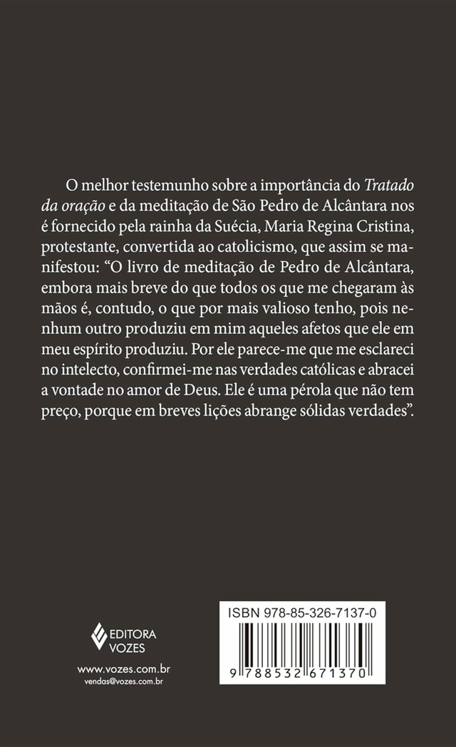 O melhor testemunho sobre a importância do Tratado da oração e da meditação de São Pedro de Alcântara nos é fornecido pela rainha da Suécia, Maria Regina Cristina, protestante, convertida ao catolicismo, que assim se manifestou: "O livro de meditação de Pedro de Alcântara, embora mais breve do que todos os que me chegaram às mãos é, contudo, o que por mais valioso tenho, pois nenhum outro produziu em mim aqueles afetos que ele em meu espírito produziu. Por ele parece-me que me esclareci no intelecto, confirmei-me nas verdades católicas e abracei a vontade no amor de Deus. Ele é uma pérola que não tem preço, porque em breves lições abrange sólidas verdades". -- por São Pedro de Alcântara (Autor)